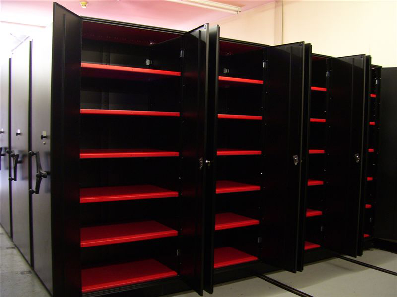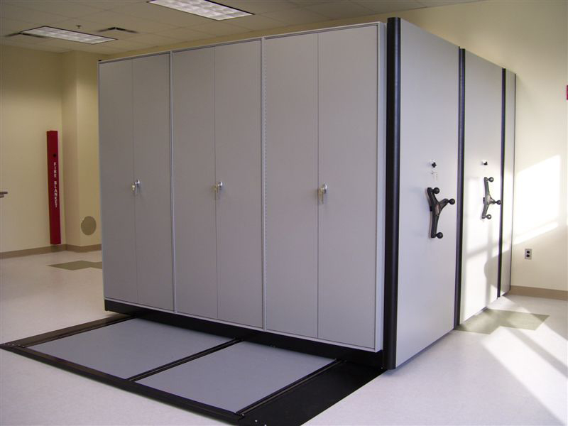 The system works well with virtually any type of inventories/equipment and is effective in maximizing storage capacity along walls in narrow rooms or corridors. The concept of the high-density lateral sliding shelving systems is simple: two or three rows of storage equipment placed in nearly the same footprint where there was only one!