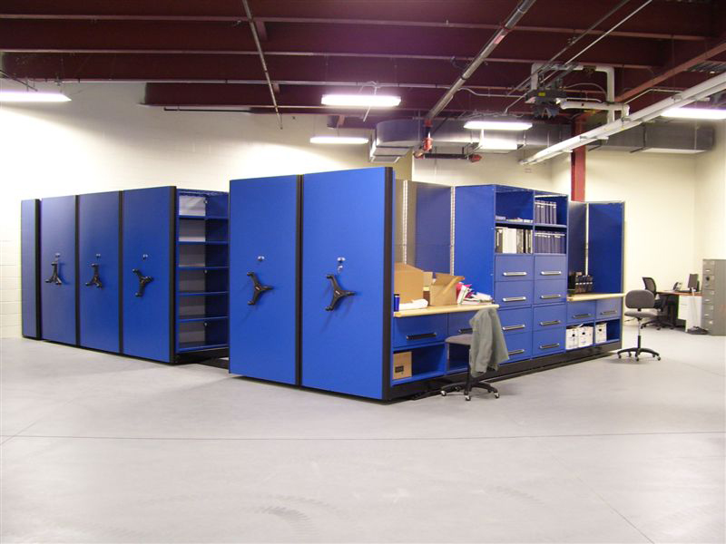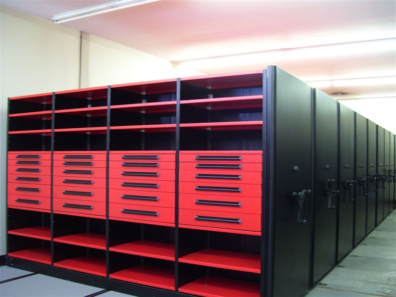 Mobile Aisles with Racks, Drawers, and Shelving